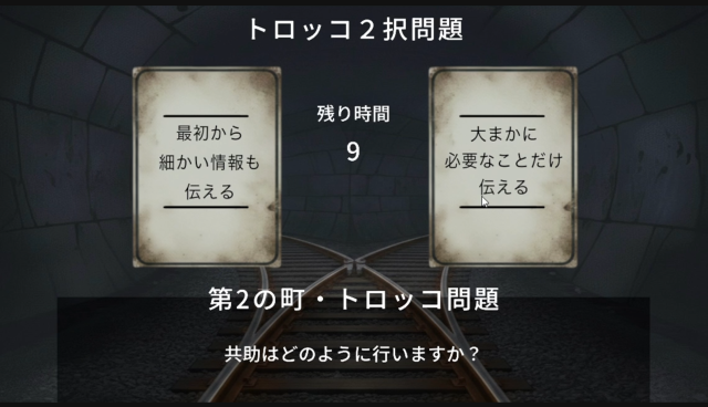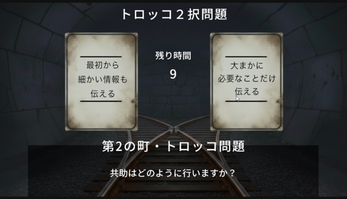 トロッコ2沢問題が出るまでの時間が短すぎて,おちついて考える余裕がない.この時間は,もっともっと長くしないと,遊べないのではないか?