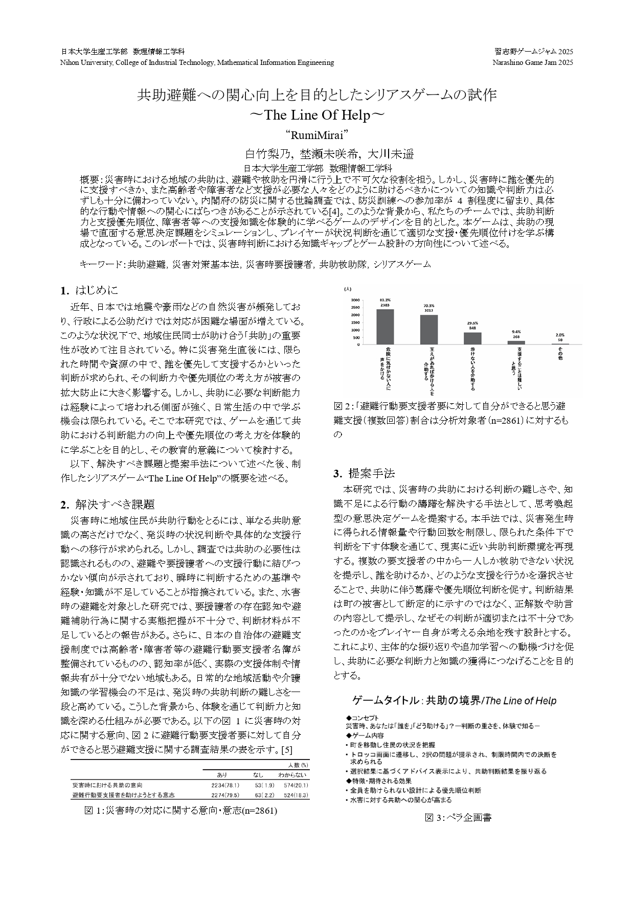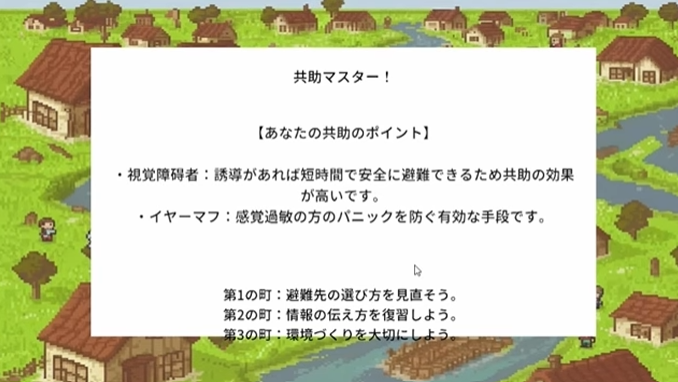そこで、本ゲームでは限られた情報と時間の中での支援判断を体験させ、共助に必要な判断基準や支援の優先順位を可視化する。結果は被害の断定ではなく助言として示し、プレイヤー自身の考察を促すことで、体験的に災害時の判断力や障害者等への支援知識の習得を目指している。