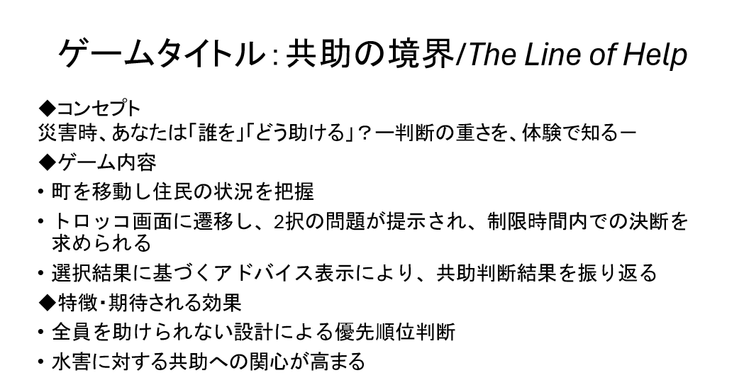 本ゲームは、災害時の共助において課題とされている「判断の難しさ」や「知識不足による行動への移行の困難さ」に着目した、判断体験型ゲームである。